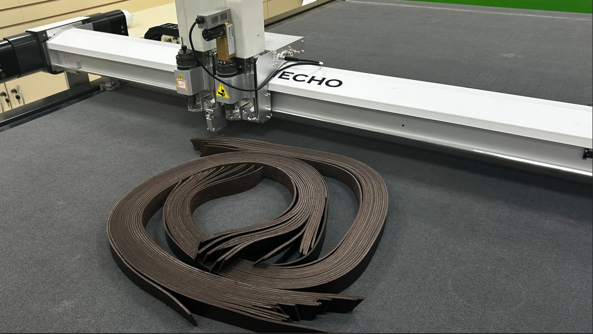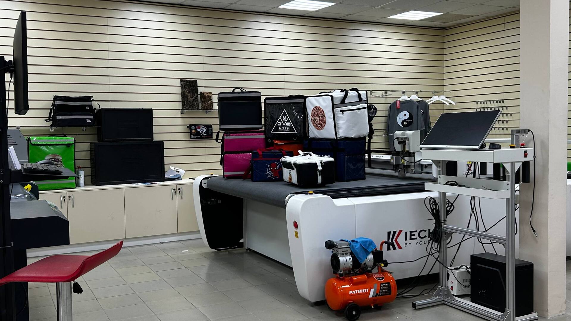Универсальный раскройный комплекс, который точнейшим образом режет ткани, кожу, ПВХ, EVA и другие материалы по лекалам. Это в 4 раза быстрее и точнее ручного раскроя. Используем его для сумок, формы, упаковки и шаблонной продукции.